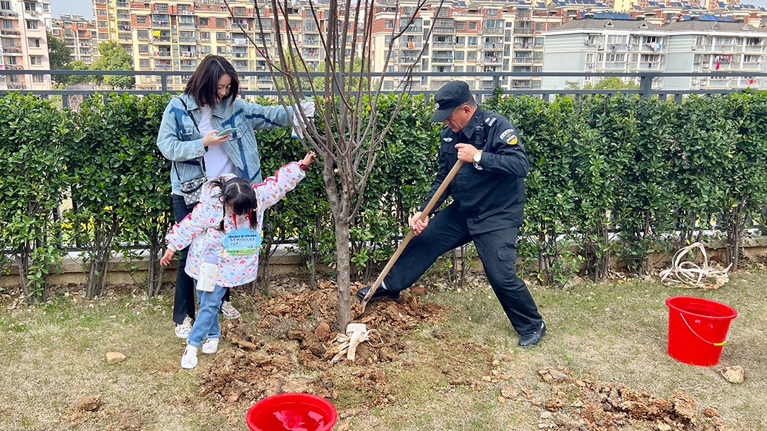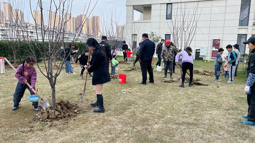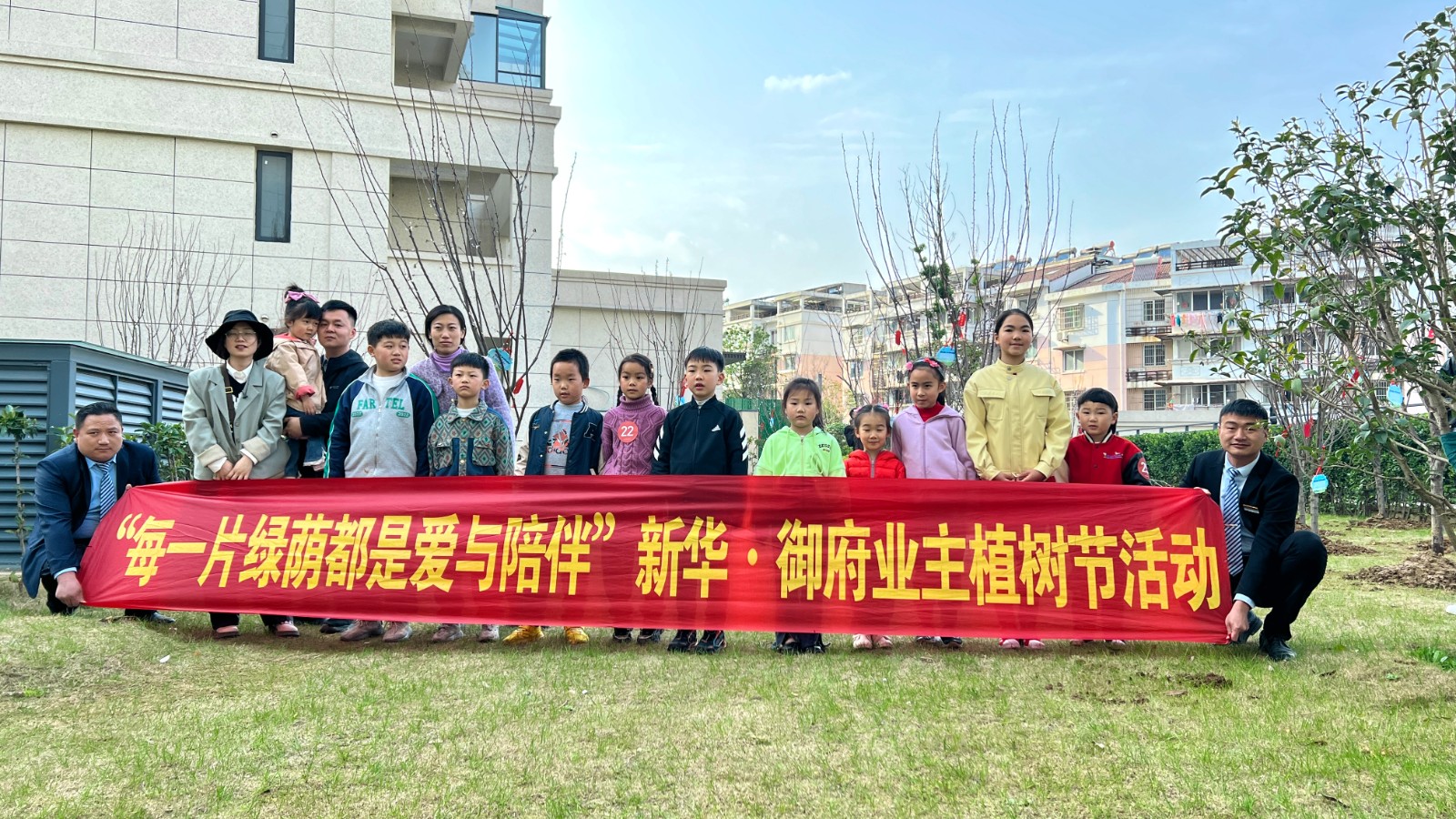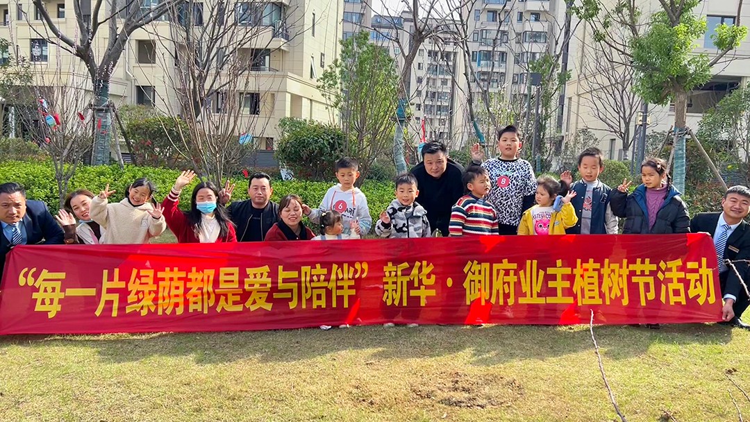 在新华御府义务植树活动点,大朋友、小朋友们各个斗志昂扬,精神饱满,或挖树坑、或抬树苗、或给树苗培土、或提桶浇水,齐心协力、相互配合,以饱满的热情投入到播种绿色的植树行动中。